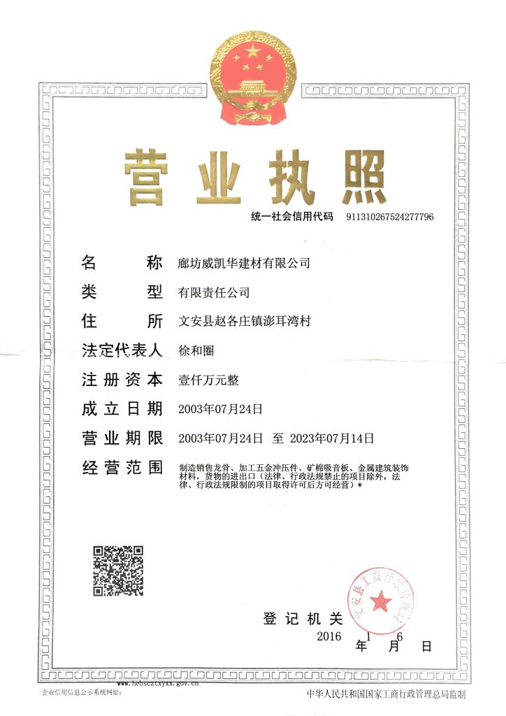 威凯华公司是生产烤漆龙骨、轻钢龙骨、配件及电缆桥架的专业工厂。现有职工150人,公司占地面积2万平方米。年生产能力烤漆龙骨900万平方米,轻钢龙骨上万吨。
